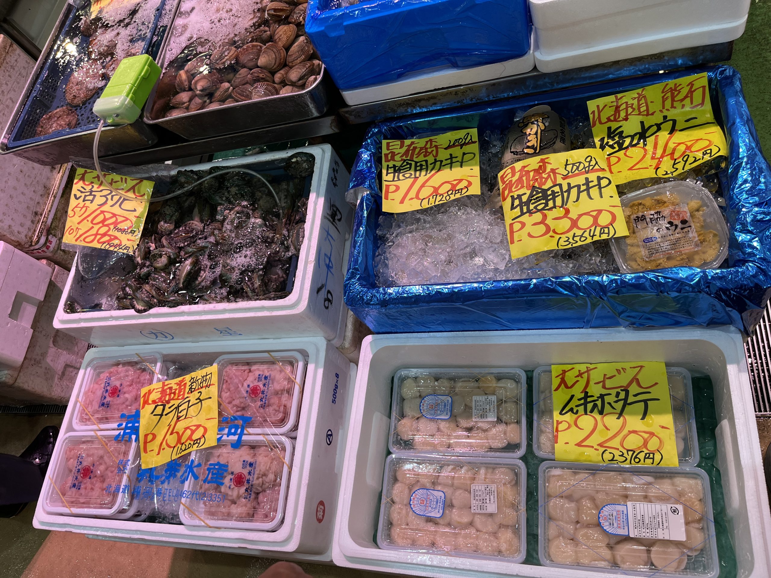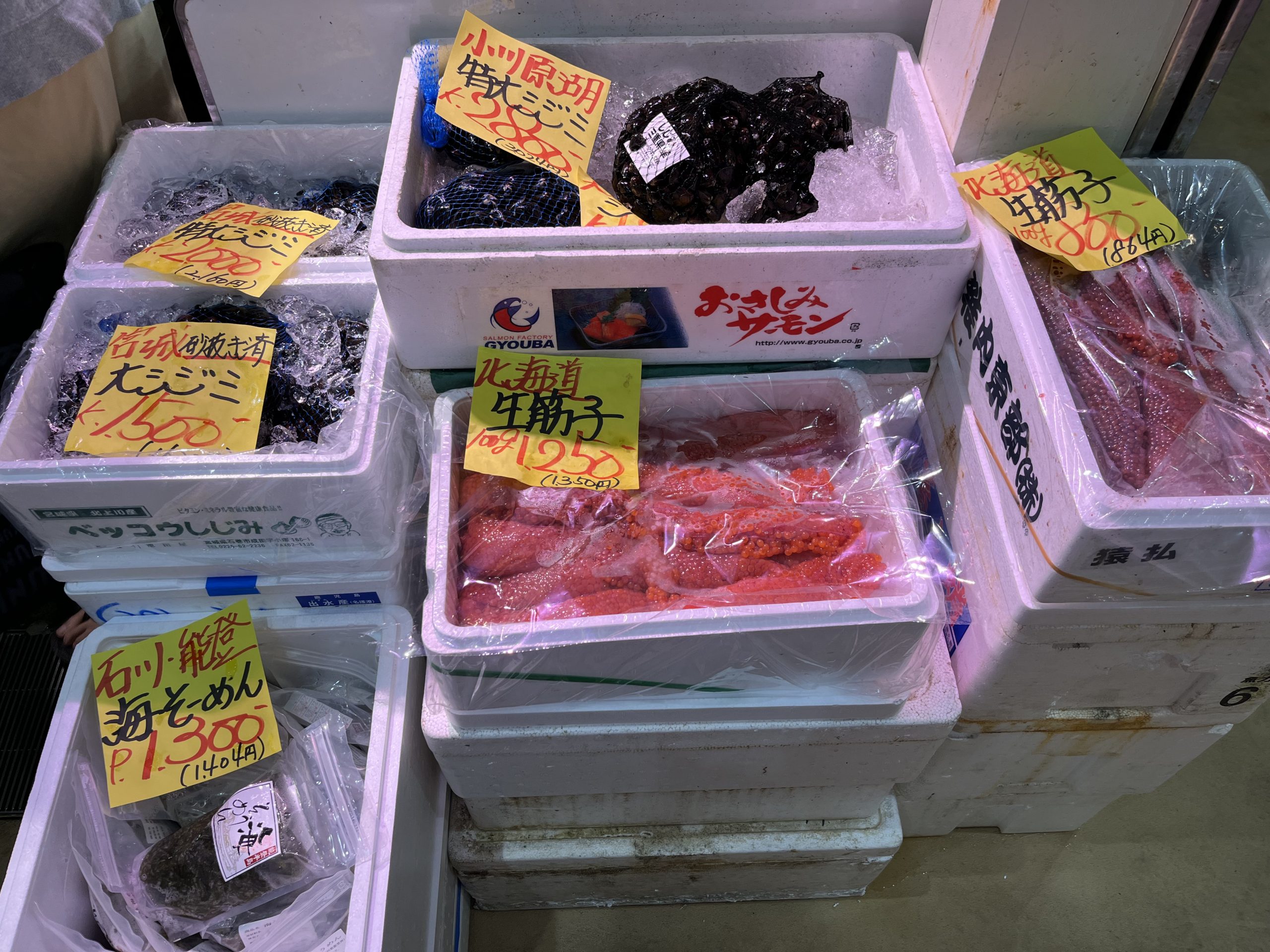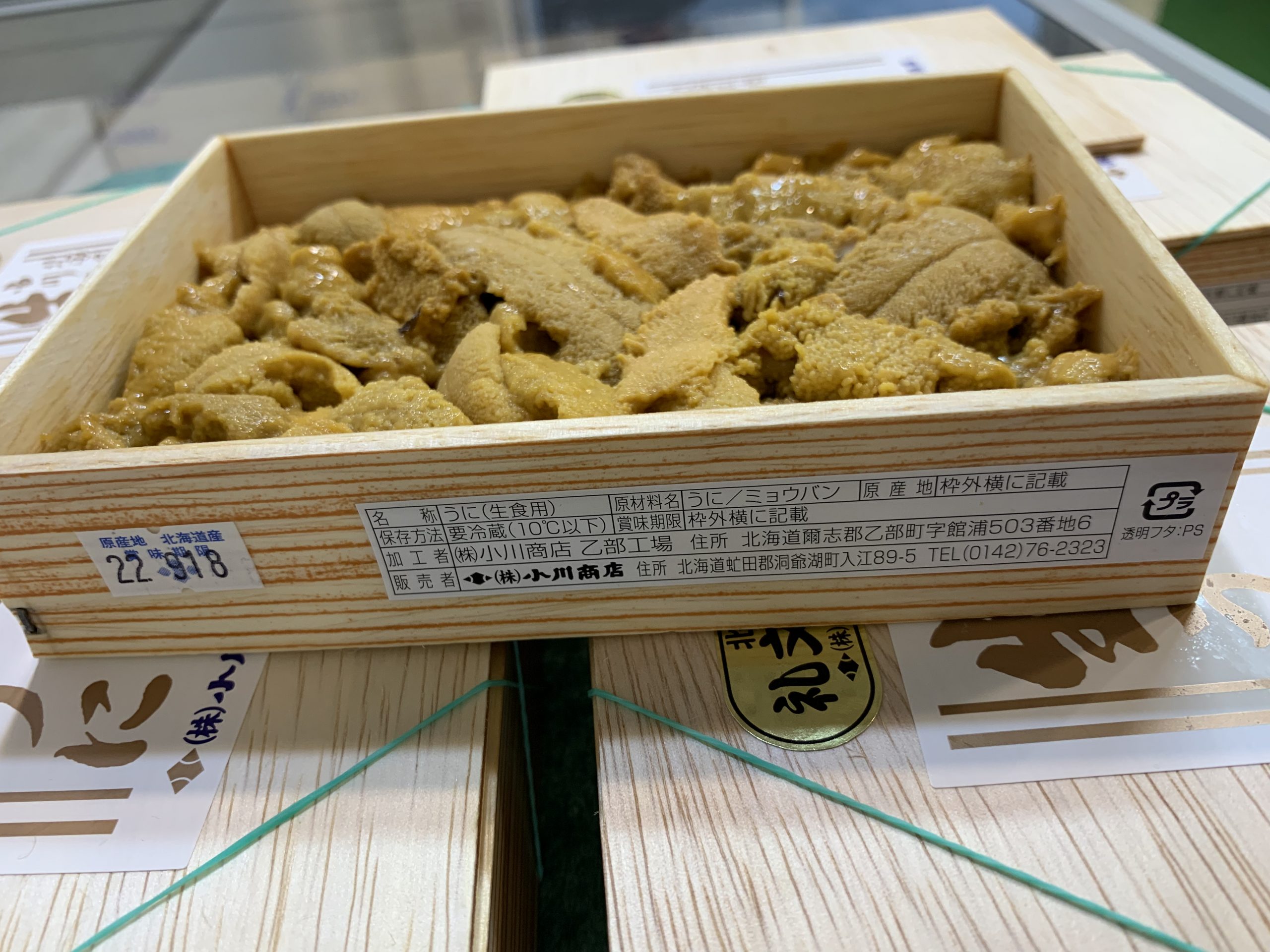 丸集小田原橋さんからは、礼文産のムラサキウニ。「買ってきたばかりのもので、味も本当に美味しいよ!」とのことでした!品質の良いものが税込4500円です!丸集さんで扱うウニの種類はいつも豊富なので、どのウニを買うか悩むという方は、ぜひサブちゃんにご相談くださいね!
