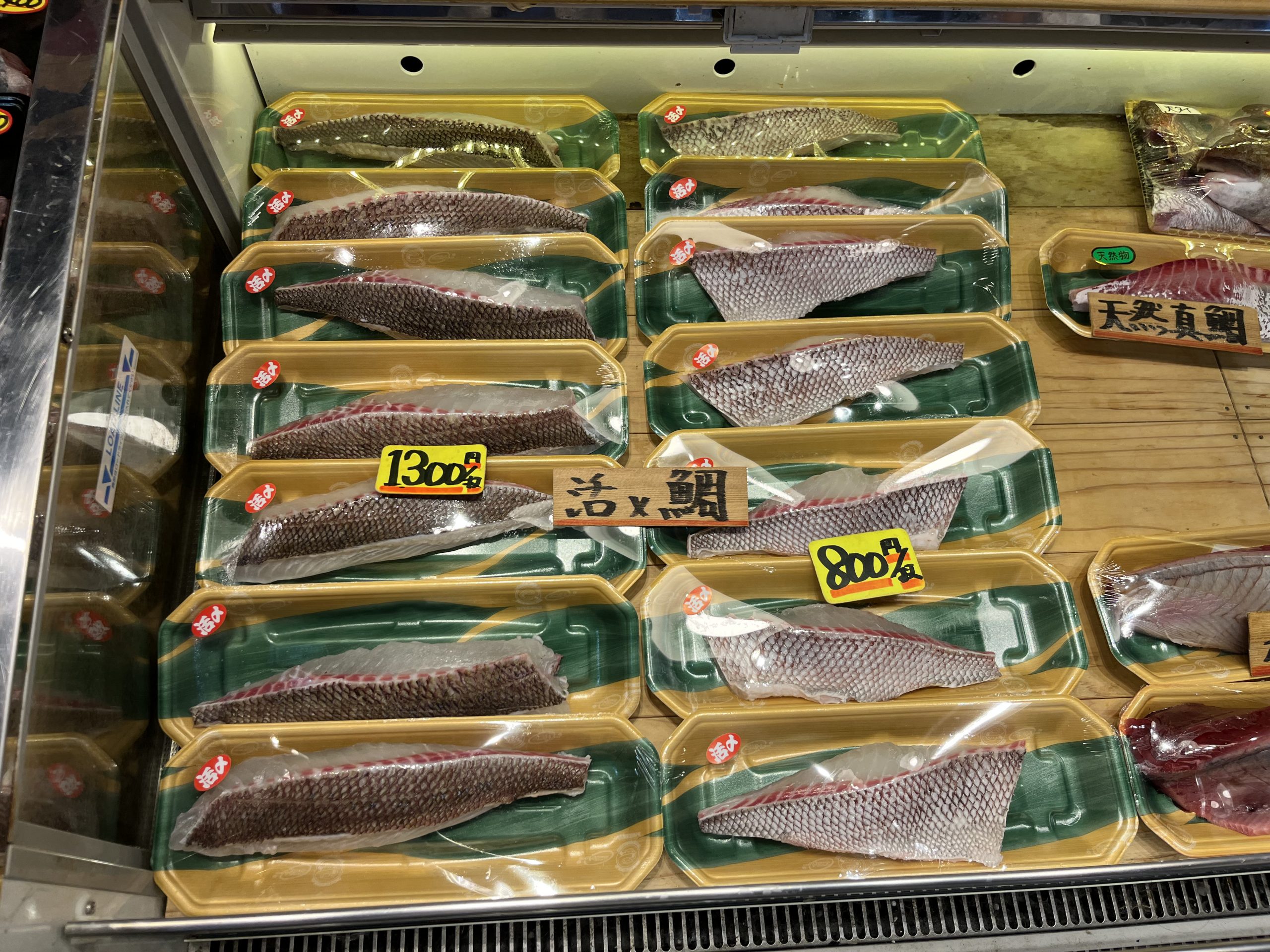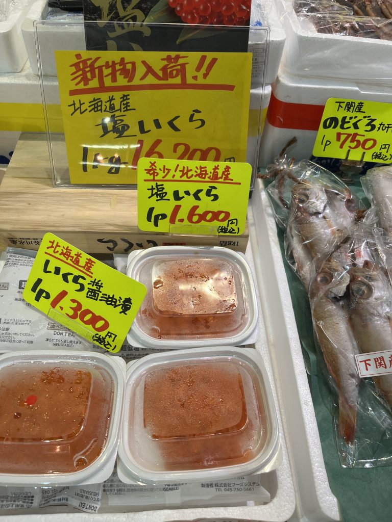 先週末のイチオシは、新サンマ!!この日サンマは大サービス品で、1本250円のところ、2本で400円とお安くなっていました。初秋の楽しみに、今週末もありましたらぜひ!さらに新物のタラ白子も並んでいます!湯引きしてポン酢や、グリルで焼いたり、あとはグラタンにしてもとろっとろで美味です!これからの季節は鍋にもぴったりですね~。そして、アカハタやキンキ(小サイズ)、山口産ノドグロが大サービス品になっていました。ノドグロは宮城、長崎、兵庫、山口と、全国各地から集結していますね!また、前週に続いて生筋子はばっちり扱いがあるほか、石垣貝やコハダ、淡路のスミイカも並んでいますね。柔らかくて人気のヤナギタコも復活していました!