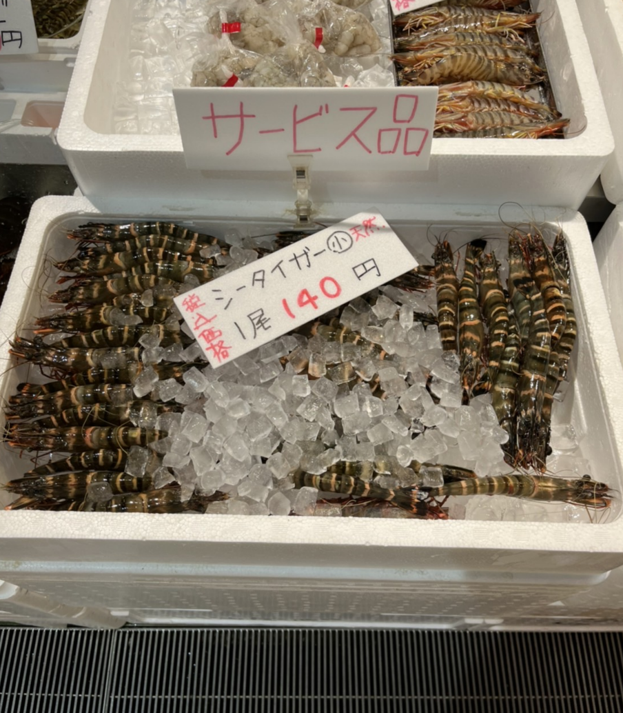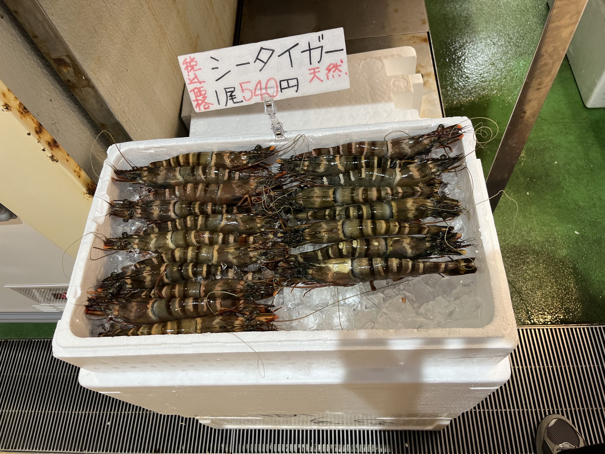 この日のイチオシは、天然シータイガー(小サイズ)!サービス品で1尾140円!数量限定で早い者勝ちでした。同じ天然シータイガーで大きなものだと1尾540円なので、もちろんサイズの違いはありますが、その安さに驚きますね!また、この日はシマエビとムキ白エビが並んでいました。小ロットで使い勝手の良い三栄さんのホタテは、この日はSサイズとMサイズの2種類ありますね。そのほか、サブちゃんユーザーのみなさんにも人気のむきえびに天使のエビ、ホワイト、メキシコブラウン、フラワー、ブラックタイガーなど、この日も定番かつ充実のラインナップ!「三栄さんのエビ、おすすめが知りたい!」といった時は、ぜひ築地のサブちゃんにご相談くださいね!