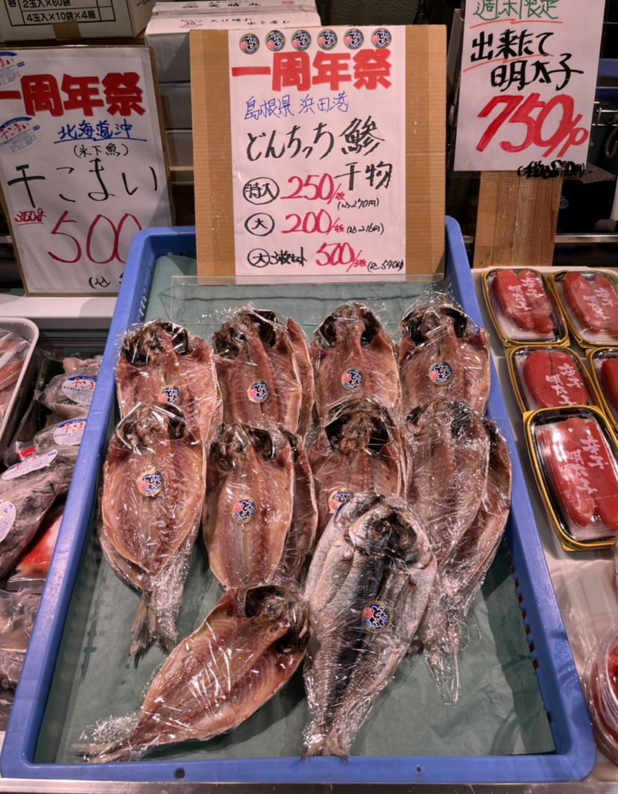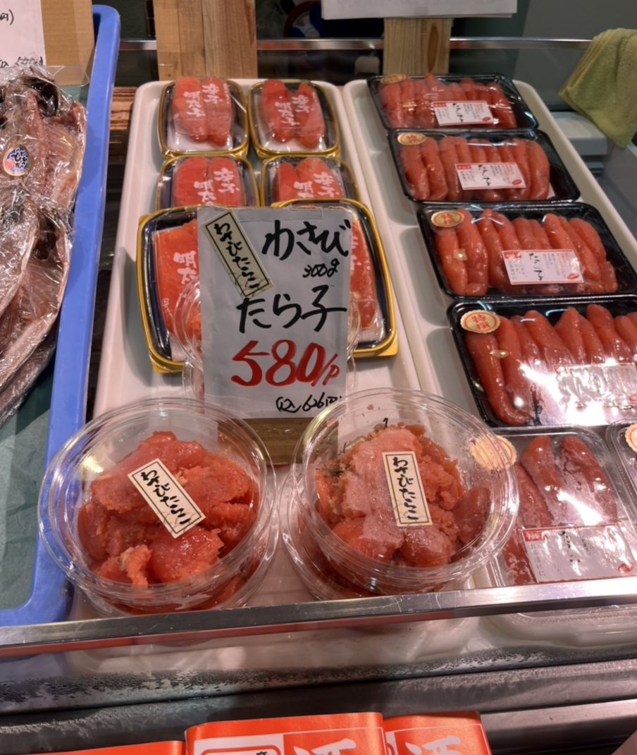 まずは築地日進さんから、特売生ウニ&わさびたらこ&どんちっち干物。この価格の生ウニは、築地でもあまり出ません!サブちゃんユーザーのみなさんにも大人気で、金曜のうちに売切れておりました。こうした人気商品、事前に取置できることもあるので、発見したら早めにご相談くださいね。わさびたらこも人気でした!おにぎりやご飯に乗せても、そのまま食べても美味しいですよ。さらに、どんちっち鯵の干物もおすすめ!どんちっちブランドは厳しい基準をクリアしたもので、脂がとてものっていることで有名です。ぜひお試しください!