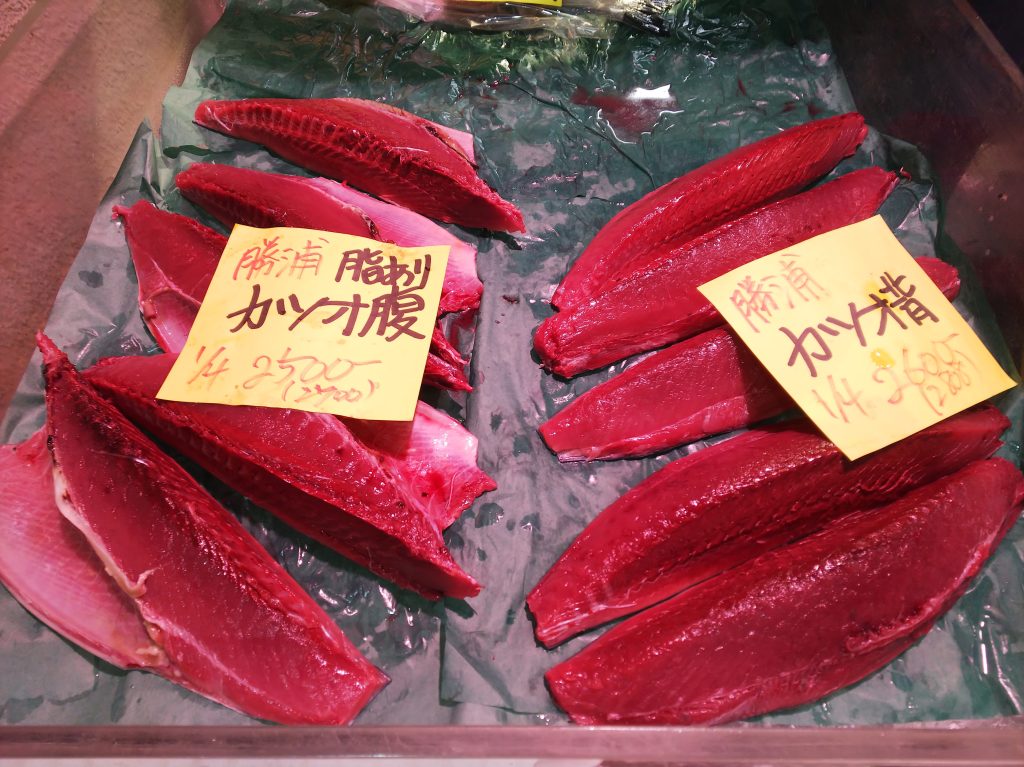 初ガツオはさっぱり・モチモチした食感が楽しめますが、4月のカツオはさらに脂が乗ってきます!この時期の仲卸の皆さんは「だんだんカツオが良くなってきた!」という言い方をされることが多いのですが、まさに脂が乗る狙い目の時期がやってくるわけです!